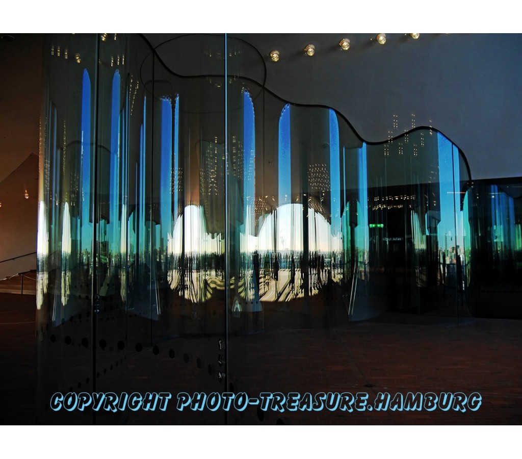 Detailansicht der Glasfenster mit Spiegelungen auf der Plaza der Elbphilharmonie.