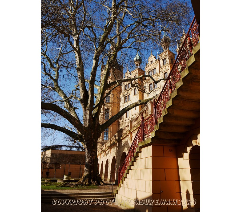 Das Foto zeigt im Anschnitt einen Treppenaufgang, einen Teil des Schweriner Schlosses von der Rückseite und ein Stück des von den Anbauten umgebenen kleinen Gartens mit altem Platanenbaum.