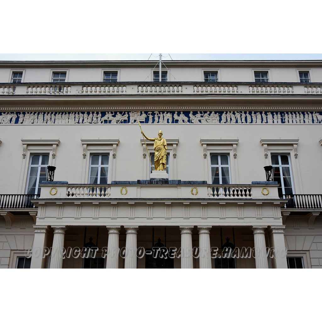 Dieses Foto zeigt einen Ausschnitt der Fassade des Atheaneum Clubs mit goldener Athene. Der Club gehört zu den rennomiertesten Clubs in London. Dem Club gehören u.a. über fünfzig NobelpreisträgerInnen an. Er wurde ursprünglich für Künstler, Literaten und WissenschaftlerInnen gedacht.