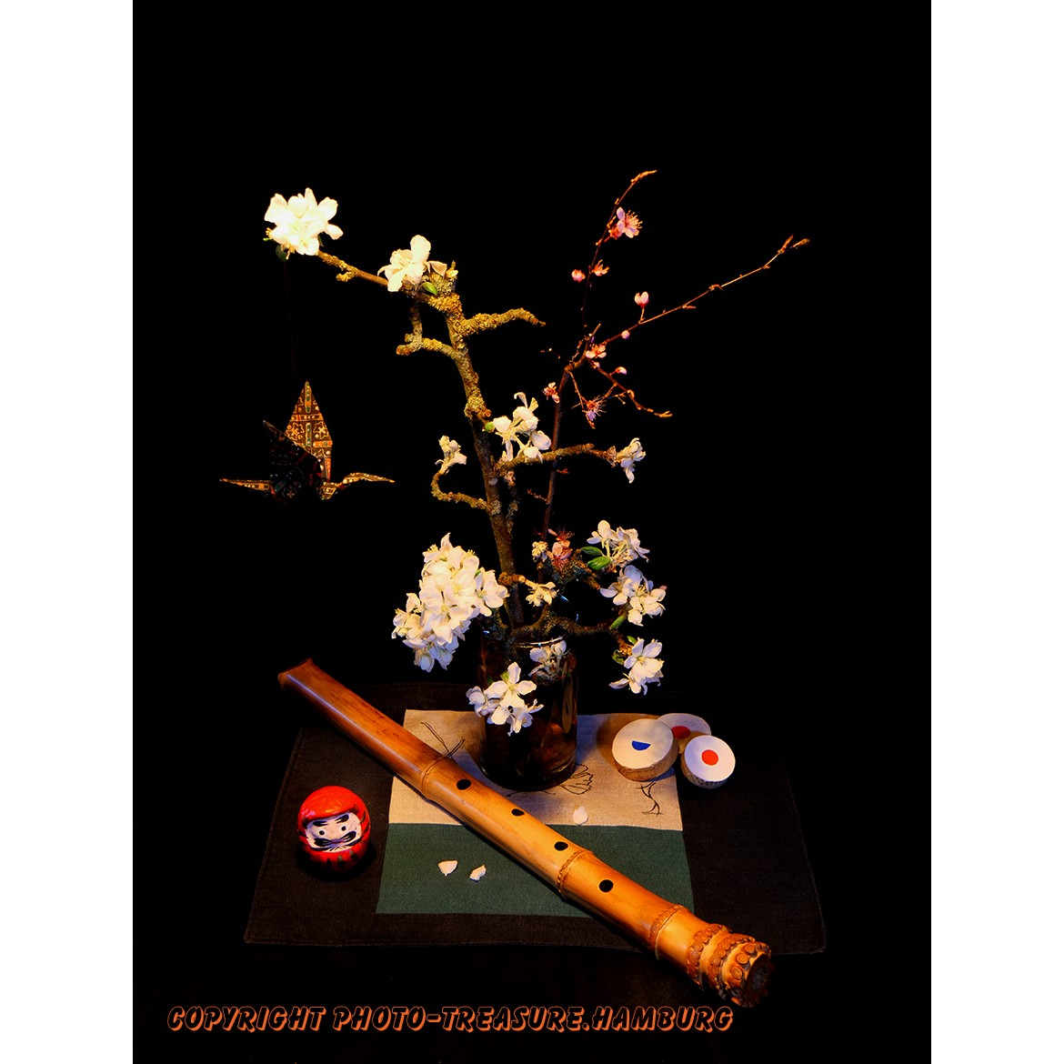 Stillleben mit den Glücksbringern "Daruma" und Origami-Kranich, Shakuhachi-Flöte, Apfelblüten- und Blutpflaumenzweig. Die Figur des Daruma soll den 1. Zen-Patriarchen darstellen, der als Begründer des Chan (chin.) oder des Zen (Jap.) gilt und im 5. Jh. aus dem Westen nach China kam. Mit zwei Augen ist er nur zu sehen, wenn zwei Wünsche in Erfüllung gegangen sind.