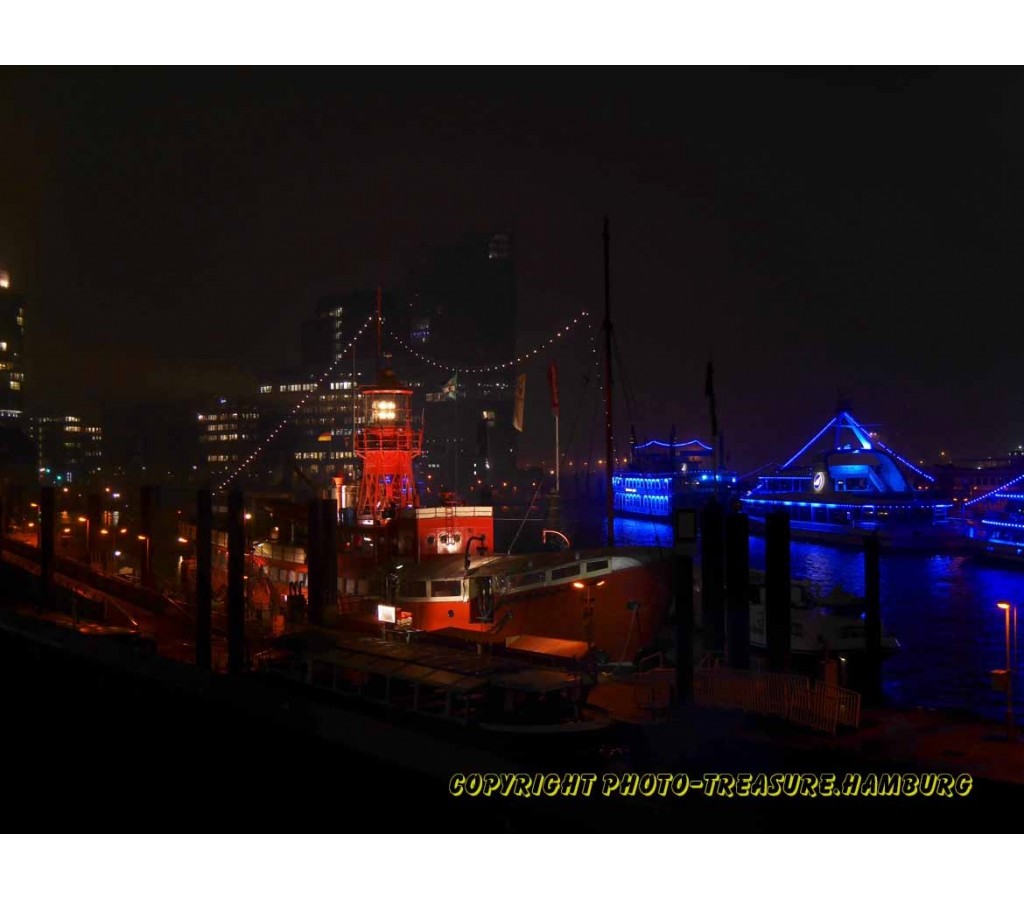 Nachtaufnahme im Hamburger Hafen bei den Landungsbrücken in St.Pauli.