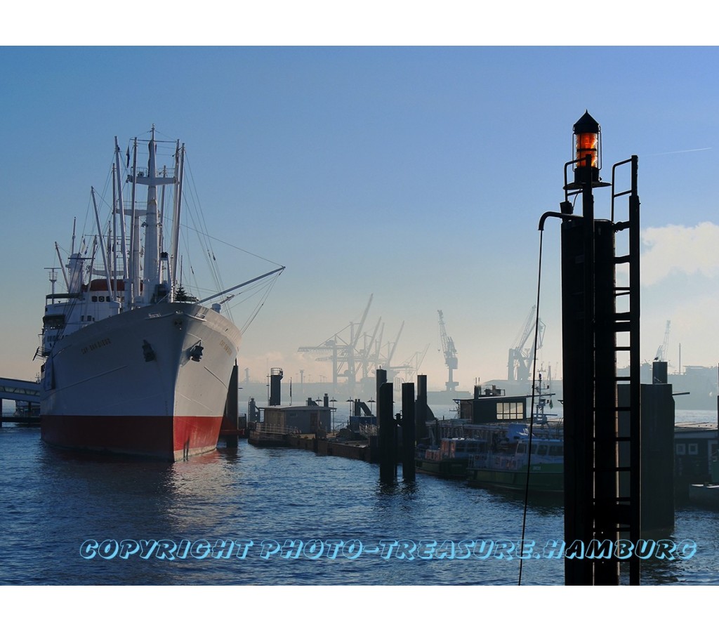 Die "Cap San Diego" mit der Hafenszene bei Sonnenaufgang.