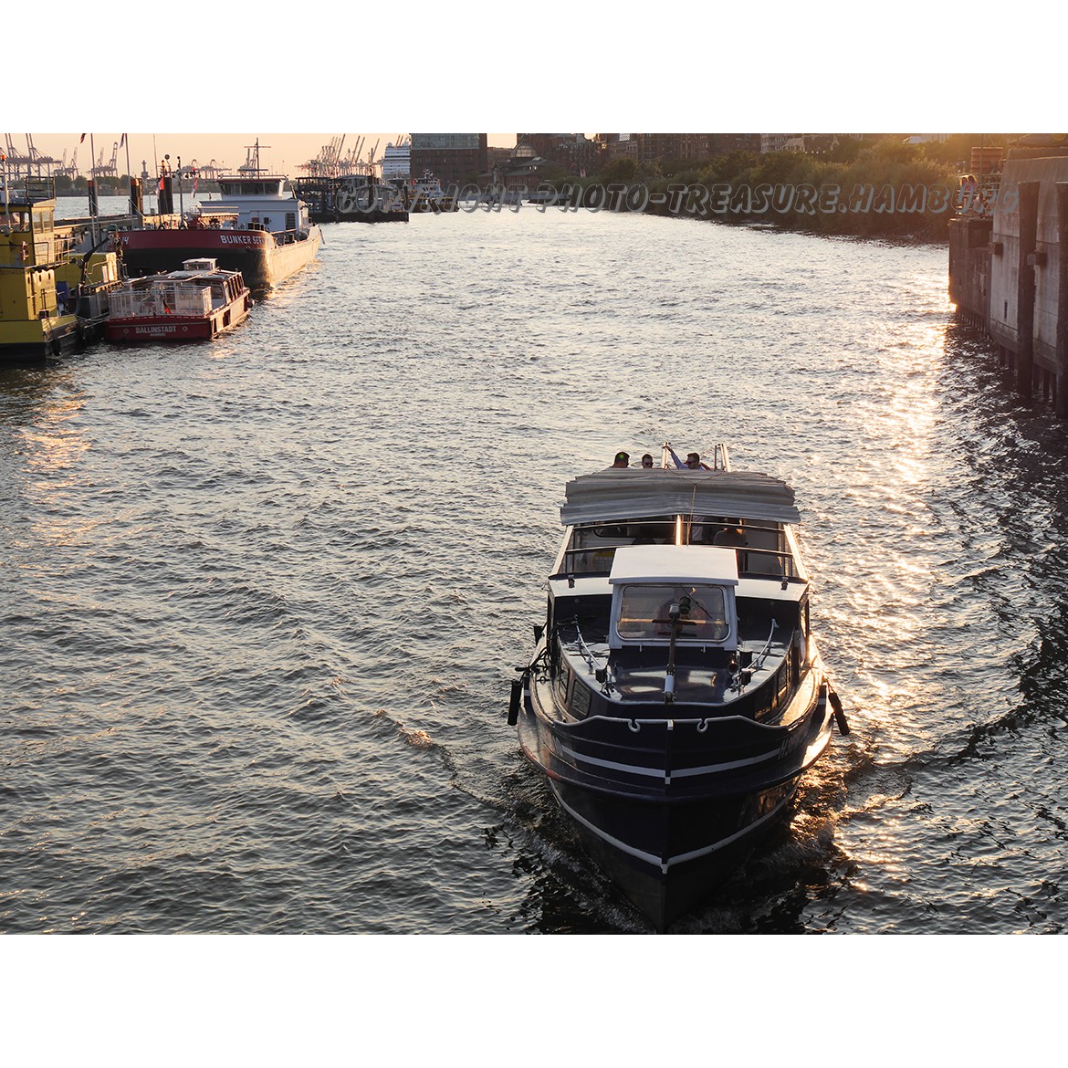 Zwischen dem Ufer der Stadt und den St. Pauli Landungsbrücken herrscht mitunter reger Schiffsverkehr. Auf diesem Foto kehrt eine Barkasse bei Sonnenuntergang zum Liegeplatz zurück.