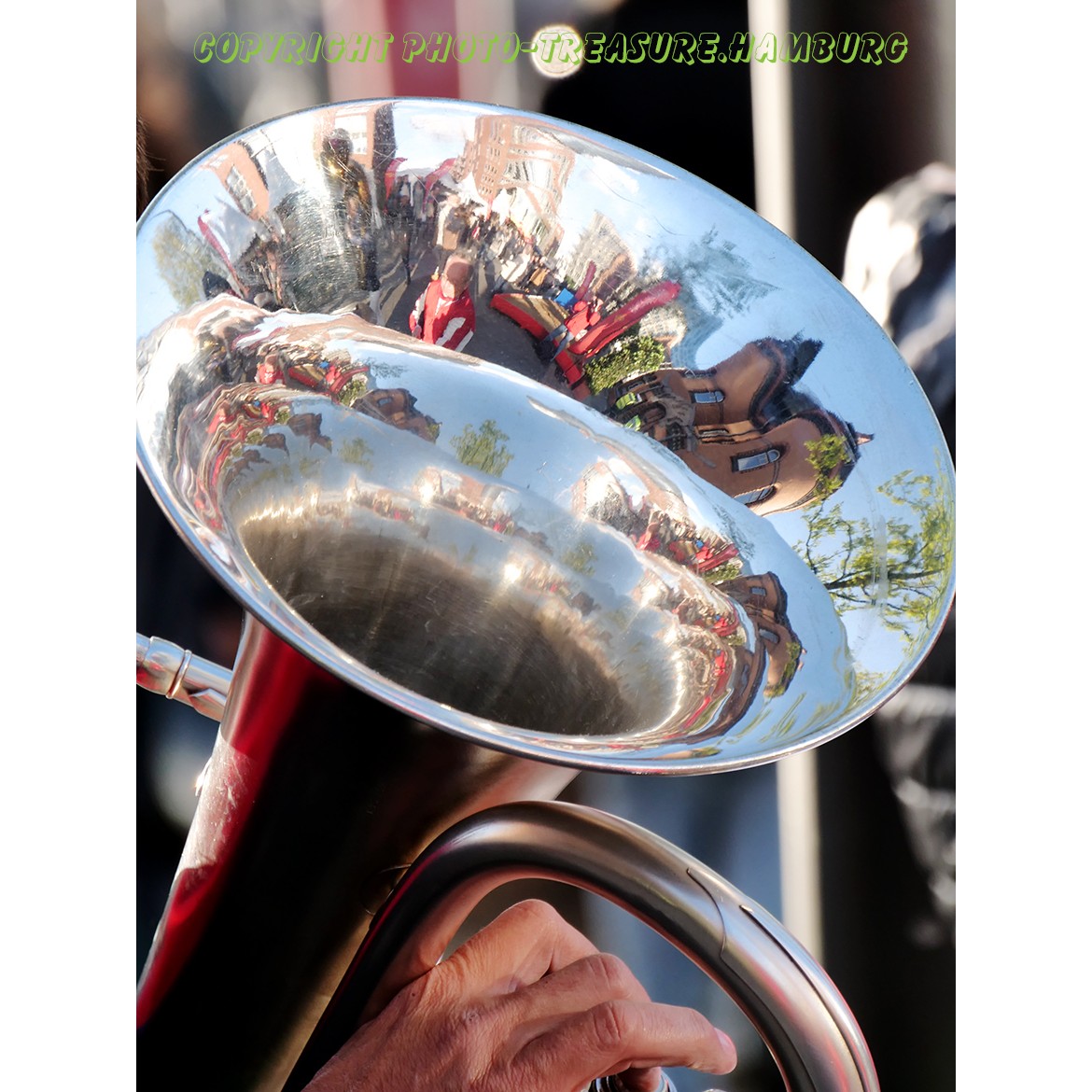 Das Fest zum Hafengeburtstag 2019 ist sehr bunt. Vielerlei Musikgruppen spielen an verschiedenen Orten am Hamburger Hafen. In dieser Tuba spiegelt sich ein Ausschnitt der Hamburger Hafencity.