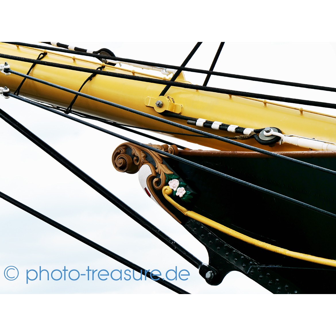 Verzierungen am Bug der Viermastbark, des Flying-P-liners "Peking". Das Segelschiff liegt völlig restauriert seit dem 07.09.20 wieder im Hamburger Hafen.