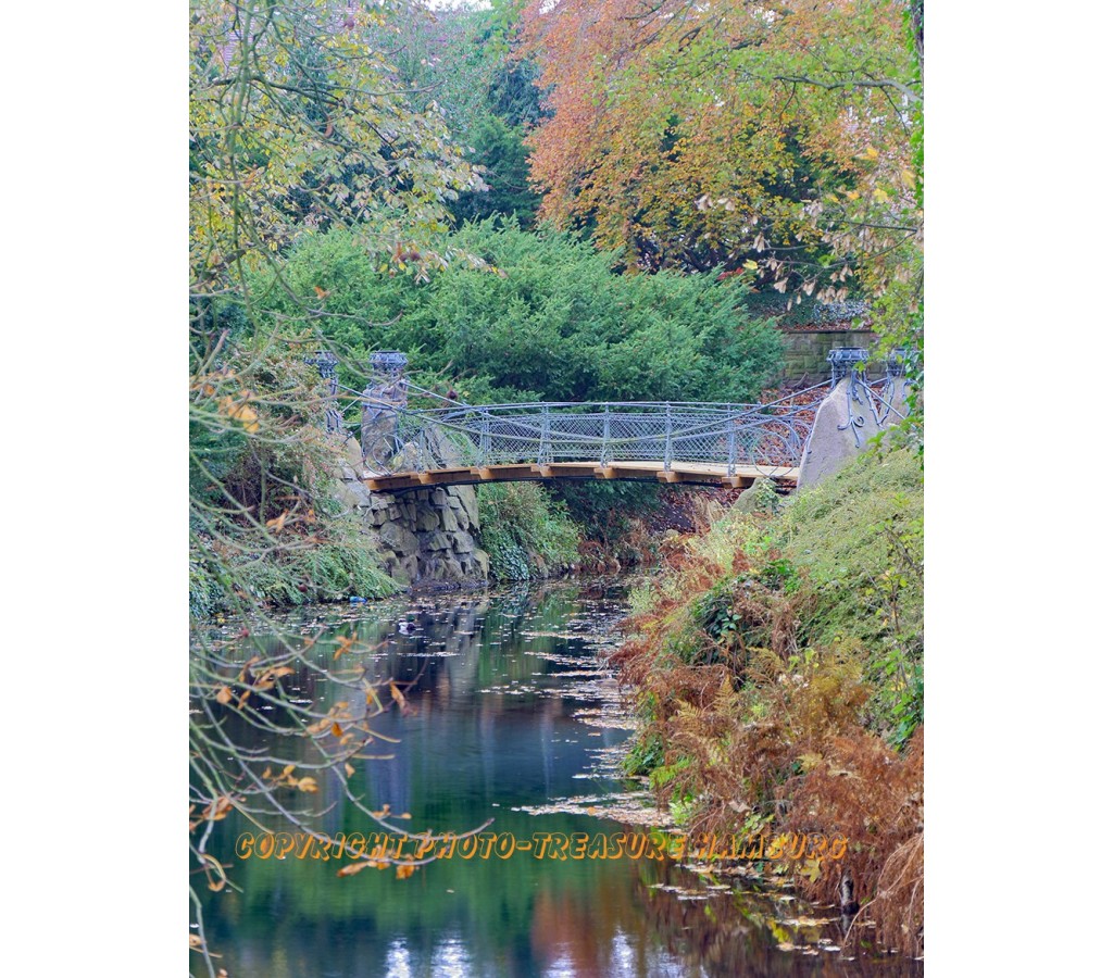 Schlossgraben des Wasserschlosses in Hamburg-Bergedorf im Herbst, mit dem Blick auf die historische Schloßbrücke.