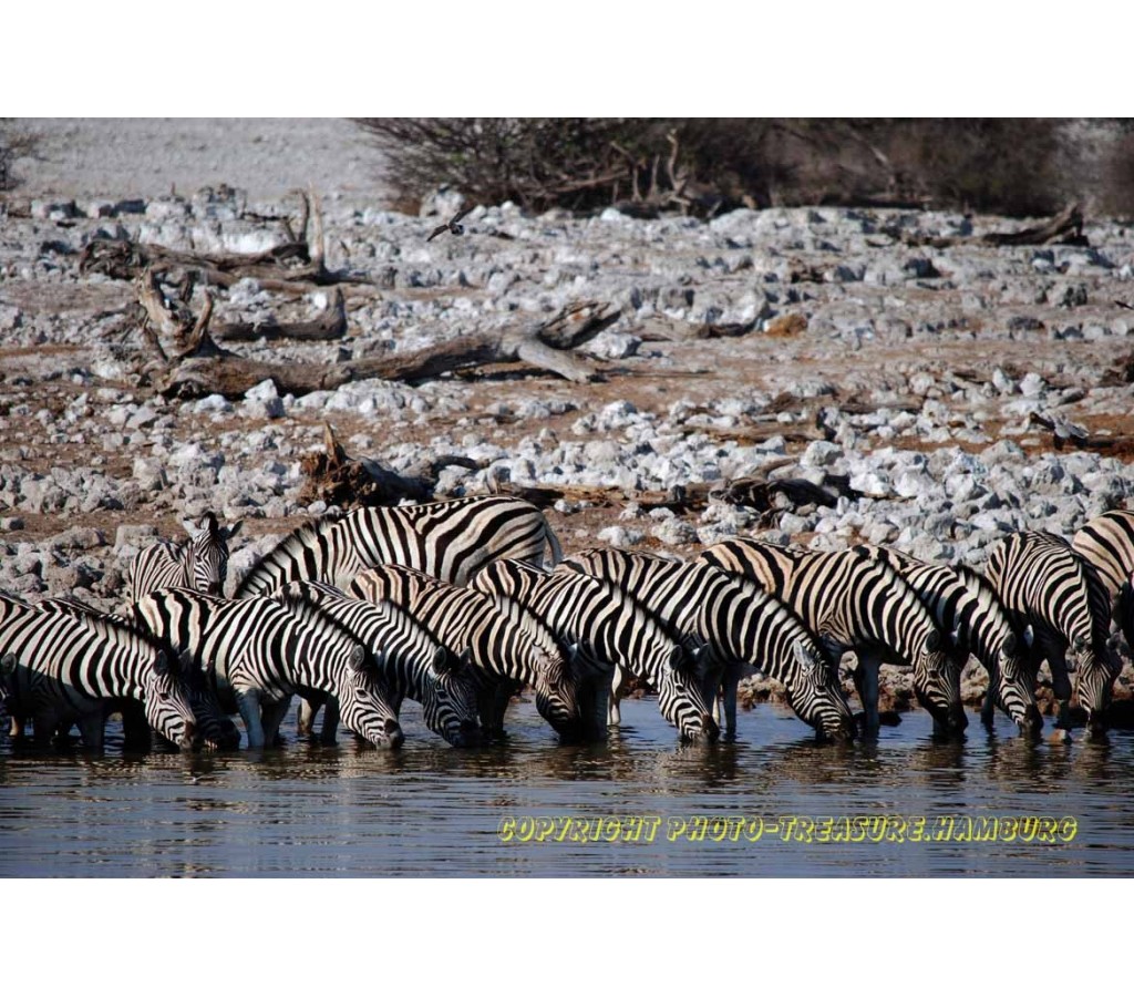 Zebras an einer Wasserstelle im Etosha-Nationalpark in Namibia.