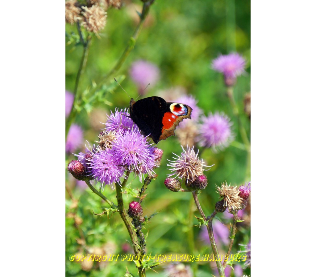Tagpfauenauge auf einer Diestelblüte als Nahaufnahme.