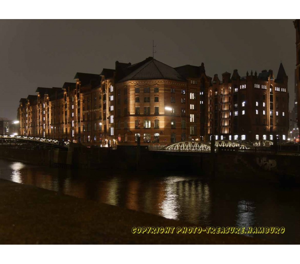 Blick auf die Speicherstadt Hamburg bei Nacht von Nordwesten.