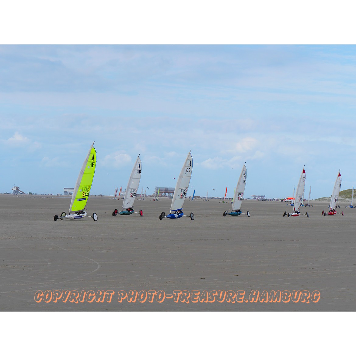 Weltmeisterschaft im Strandsegeln in St. Peter-Ording 2018. Start der kleinsten Klasse der Strandsegler.