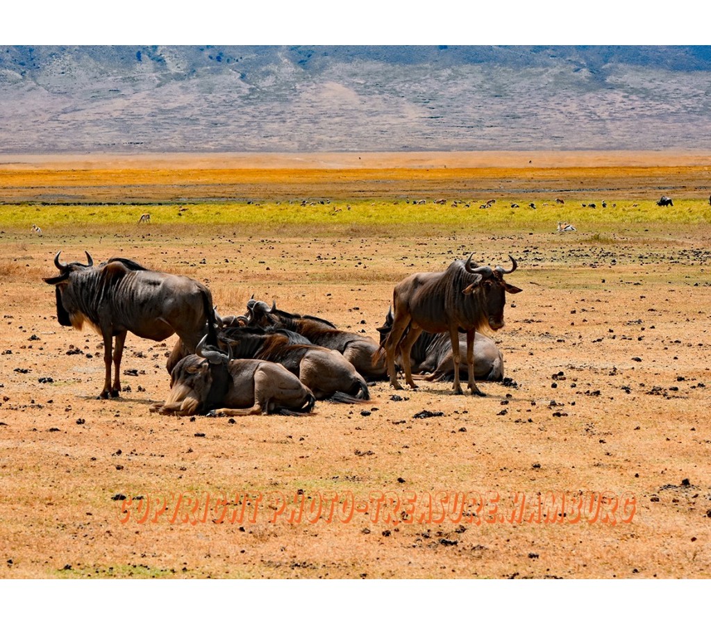 Diese Gnus leben im Ngorongoro-Krater.