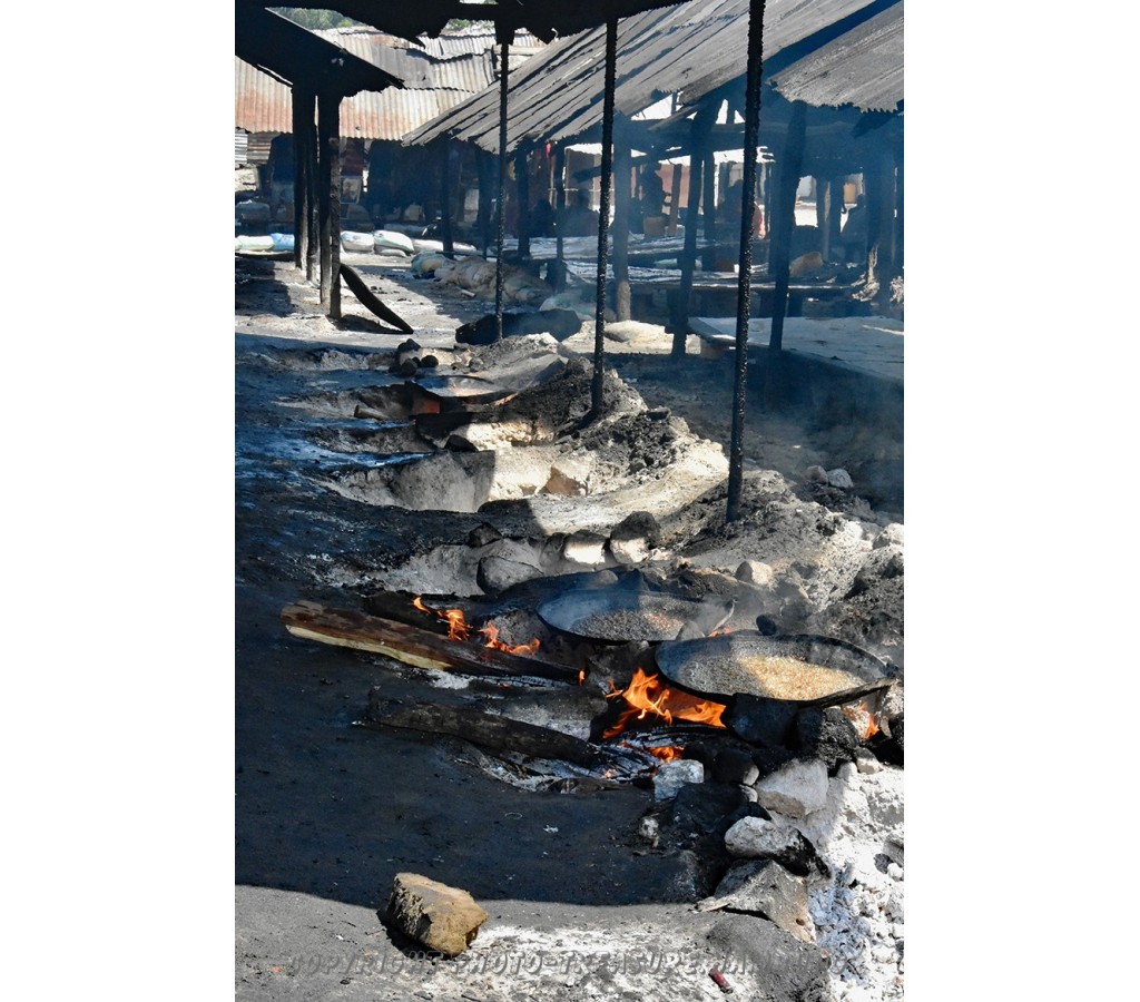 Der Blick fällt im Vordergrund auf Pfannen, in denen Essen zum Verkauf zubereitet wird.