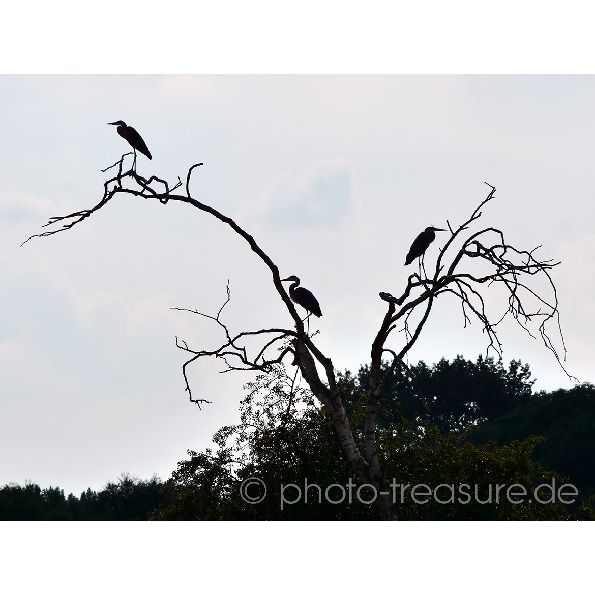 In diesem Abschnitt des Naturschutzgebiets Boberger Niederung im Südosten Hamburgs, der zur Marschlandschaft gehört, befinden sich drei Fischreiher auf einem "Hochsitz". In diesem Abschnitt waren viele Störche, Silberreiher und Graureiher auf der Jagd auf einer Fläche von ca. einem Hektar.
