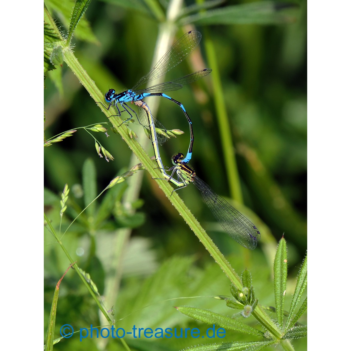 Große Pechlibellen bilden während der Paarung ein Paarungsrad. Das Männchen ist blau gefärbt. Die große Pechlibelle ist eine häufig vorkommende Kleinlibelle.