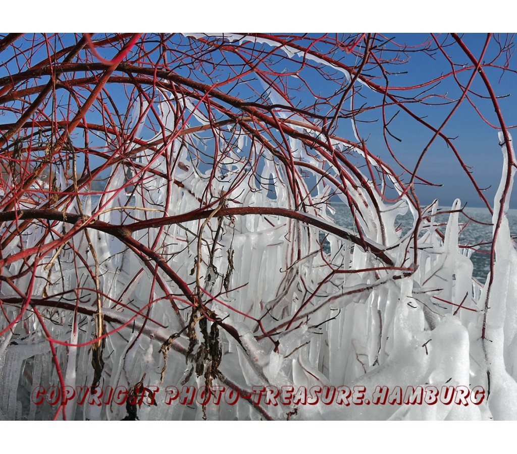 Nahaufnahme eines vereisten Hartriegelstrauchs am Schweriner Innensee.